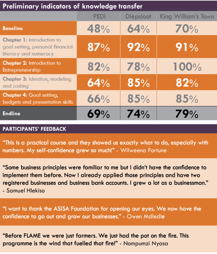 The ASISA Foundation’s FLAME programme empowers beneficiaries in low-income areas by transferring financial literacy knowledge and skills, coupled with basic entrepreneurship and business development skills to foster financial capability and enable greater economic participation.